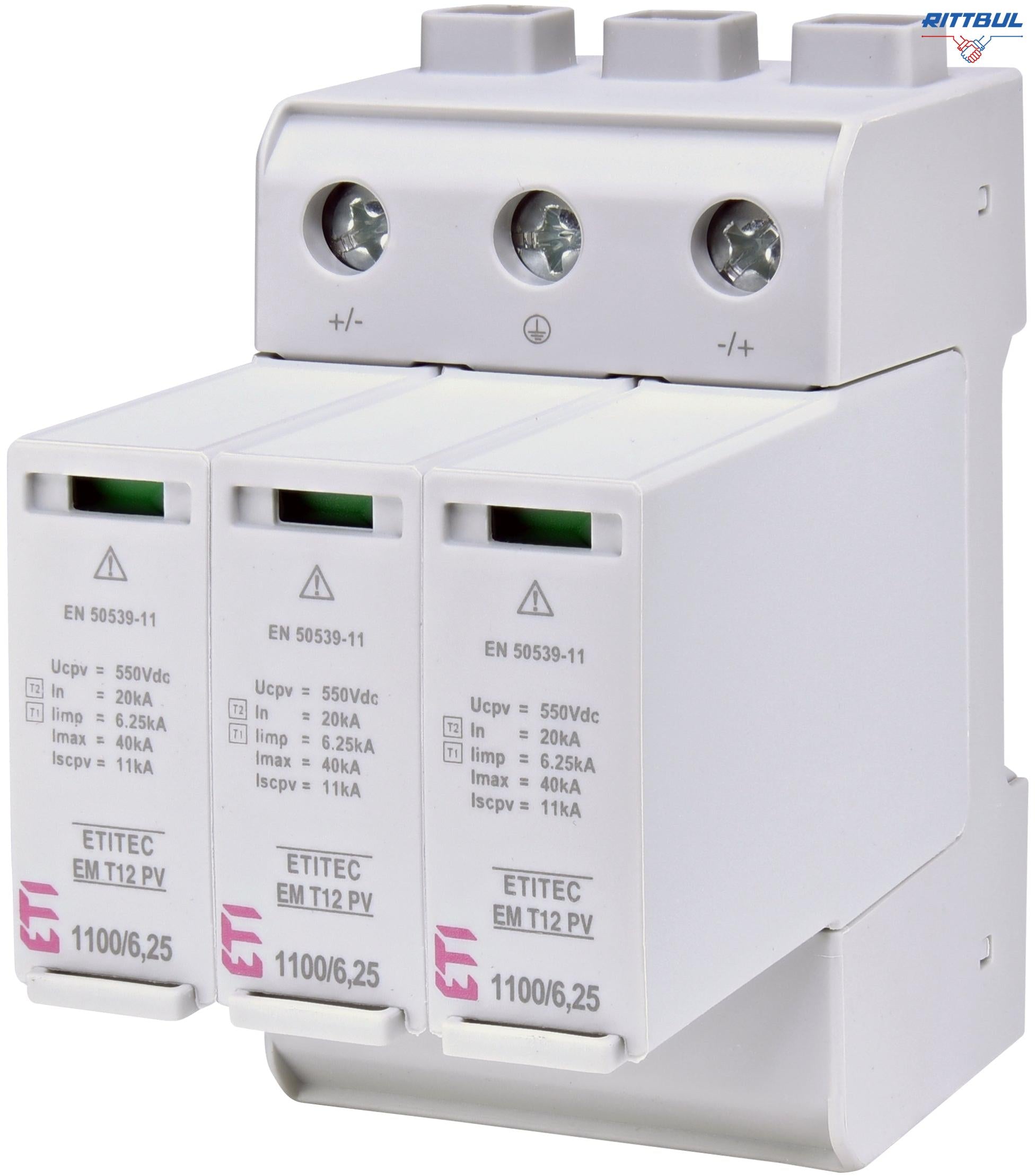 Катодният отводител ETITEC EM T12 PV 1100/6,25 Y е предназначен за защитата от пренапрежение в съответствие с VDE клас B и C и тип I и II според IEC. Модулният дизайн позволява бързо и лесно да бъде подменен само необходимия елемент.