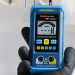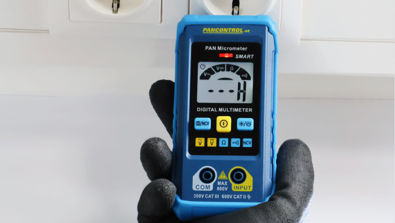 PAN Micrometer е компактен, интелигентен цифров мултицет за професионална употреба в електрически инсталации. Устройството предлага прецизни измервания на постоянно и променливо напрежение (1 mV до 600 V) и съпротивления (1 Ω до 40 MΩ). Автоматичният избор на обхват улеснява работата дори в сложни работни ситуации. Снабден с LCD дисплей. Има вграден 1-полюсен фазомер със звукова сигнализация, която позволява бързо идентифициране на кабели под напрежение. Безконтактният тестер за напрежение (NCV) открива променливо напрежение на три нива и показва интензитета на напрежението чрез различни сигнални тонове и LED показания – идеален за бързи предварителни тестове.