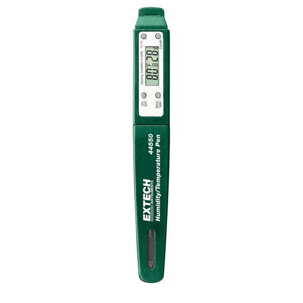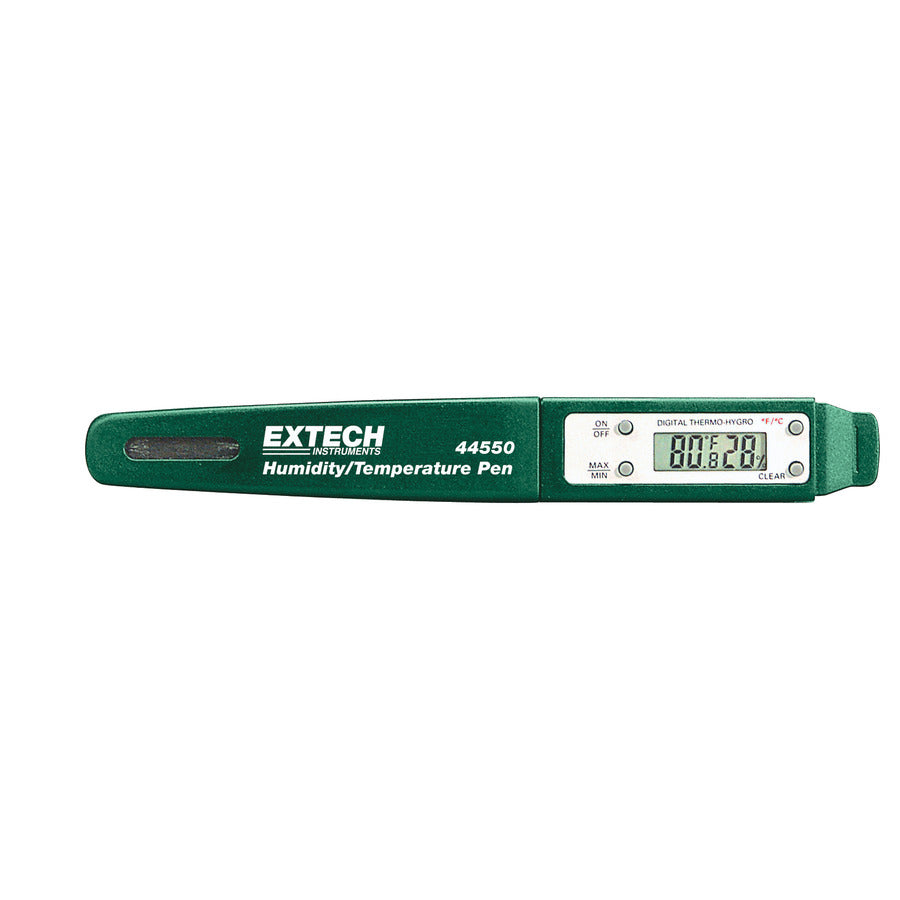 EXTECH 44550 e портативен тестер за влажност и температура с дизайн, наподобяващ химикалка.