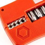 Този набор от битове се състои от 12 броя накрайници и магнитен държач с магнит. С него можете много лесно да оголите и различни кабели с размери 0.75, 1.0, 1.5 и 2.5 мм². В комплекта има 1/4 държач за битове, който може да се закрепва към основата, превръщайки устройството за кабели в отвертка.