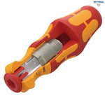 Ръкохватка с тресчотка Wera Kraftform Kompakt VDE, с вградени 40 зъба / ъгъл на връщане 9°). Тресчотката ускорява завинтването, без да се налага да променяте позицията на инструмента. Тресчотковият механизъм, изцяло вграден в ръкохватката, осигурява много удобна и комфортна работа. Бърза смяна на накрайниците само с едно натискане на пръстена.
