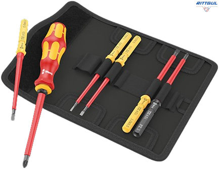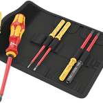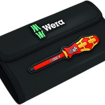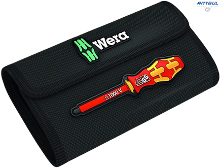 Една ръкохватка 817 VDE Kraftform и 6 VDE накрайника с цветна кодировка „Take it easy“: цветово кодиране и лазерно гравирано обозначение на размера. Индивидуално тествани при 10 000 V за безопасна работа при одобрено напрежение до 1 000 V. В здрав калъф за колан. С помощта на предоставените самозалепващи се ленти за закрепване с кукички калъфът може да се прикрепи към компонентите на Wera 2go, към стена, рафт или количка в работилницата.