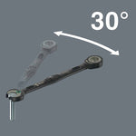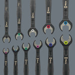 Комплект от 11 пръстеновидни тресчотни ключове Wera. За шестостенни винтови глави и болтове. С функция за задържане, осигурена от метална пластина в устата, което намалява риска от загуба на винтове и вложки. Със своите изключително твърди зъби, сменяемата метална пластина в устата закрепва винтовете и вложките и намалява риска от подхлъзване. Интегрираният краен ограничител може да предотврати подхлъзване на главата на винта и позволява прилагане на високи въртящи моменти.