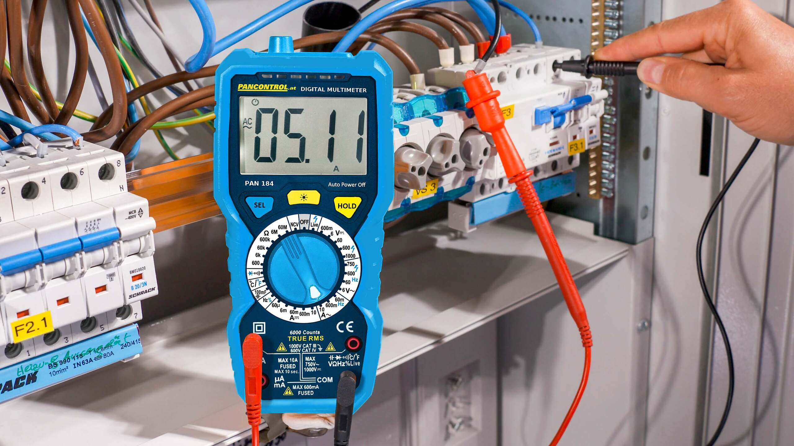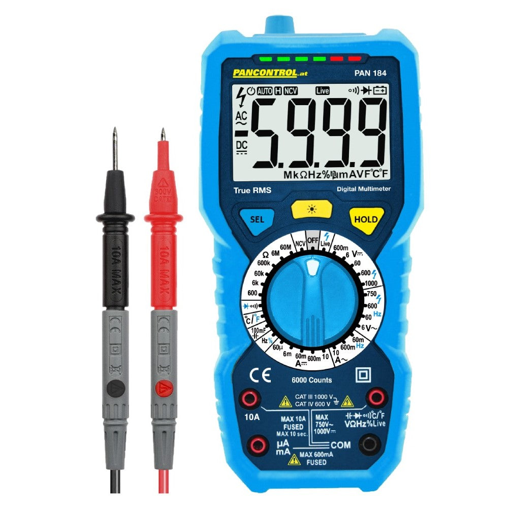 PAN 184 е надежден True RMS цифров мултицет за професионални приложения в електрическите инсталации и техническата поддръжка. Той е идеален за прецизни измервания на истинските средноквадратични стойности (true RMS) на напрежения и токове – дори при нелинейни товари – и покрива широк спектър от измервателни функции.