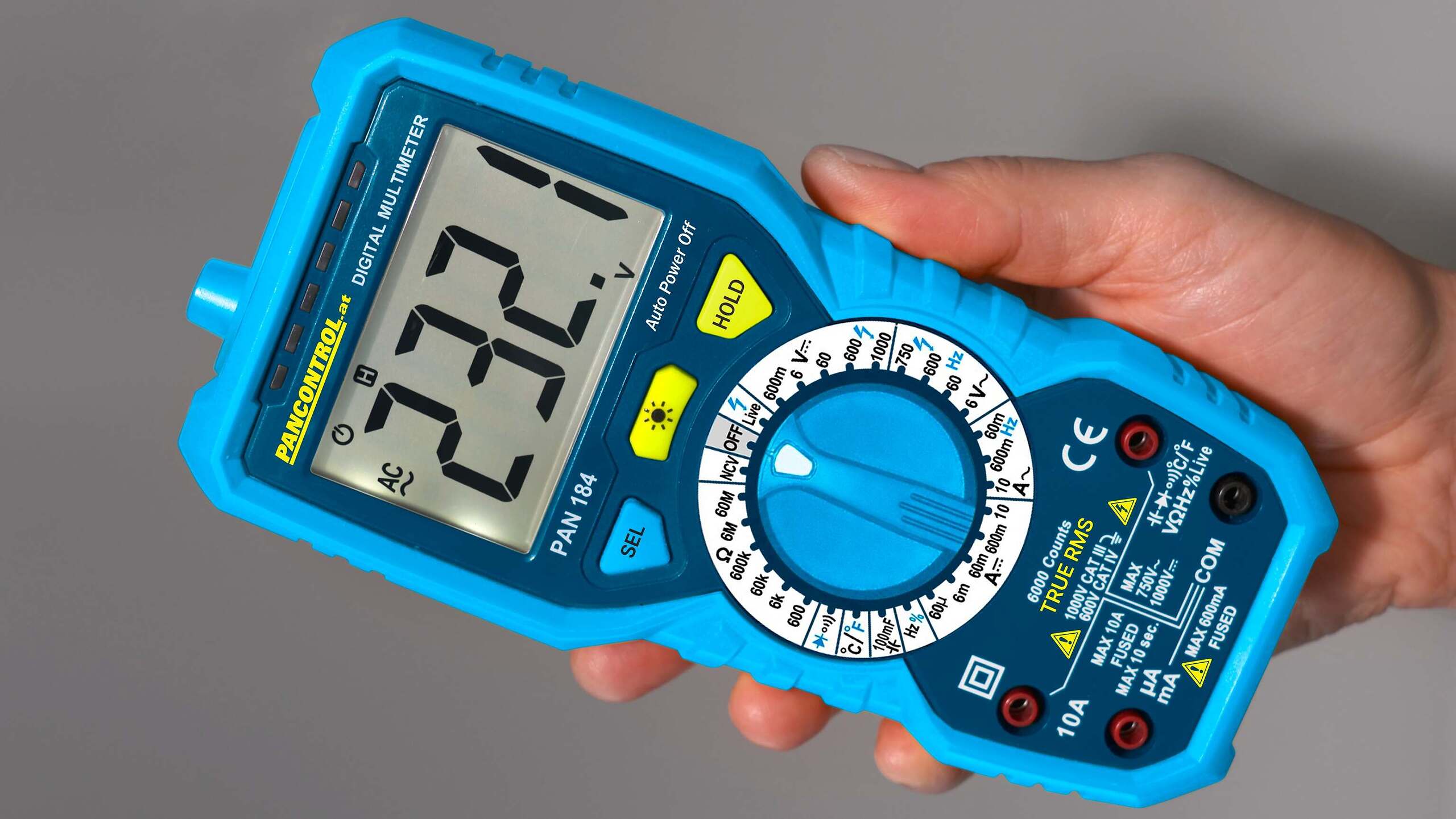 Особено практичен: PAN 184 разполага с безконтактен тест за напрежение (NCV), еднополюсен тест за фаза със звукова аларма и вградено LED фенерче – идеален за употреба в слабо осветени среди. Функцията за задържане на данни, автоматичният избор на диапазон и подсветката на 27-милиметровия дисплей допълнително улесняват ежедневната работа.