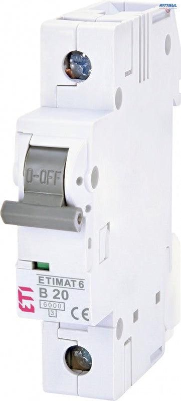 Миниатюрният автоматичен прекъсвач ETIMAT 6 Крива B 1p 6kA 20A е предназначен за защита от претоварване и късо съединение на монофазни консуматори до 230V AC.