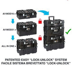Предлага се в здрав шприцован корпус, изработен от съполимерен полипропилен, способен да издържи на удари, груба употреба и сурови метеорологични условия, разполага с две странични дръжки, подвижна дръжка за количка (990 mm. разширена височина) и четири здрави и безшумни колела. Горното отделение, затворено от горния капак, съдържа подвижна тава за резервни ръчни инструменти, поставена върху вдлъбнатина, където могат да се съхраняват 5 малки кутии с компоненти или лаптоп.