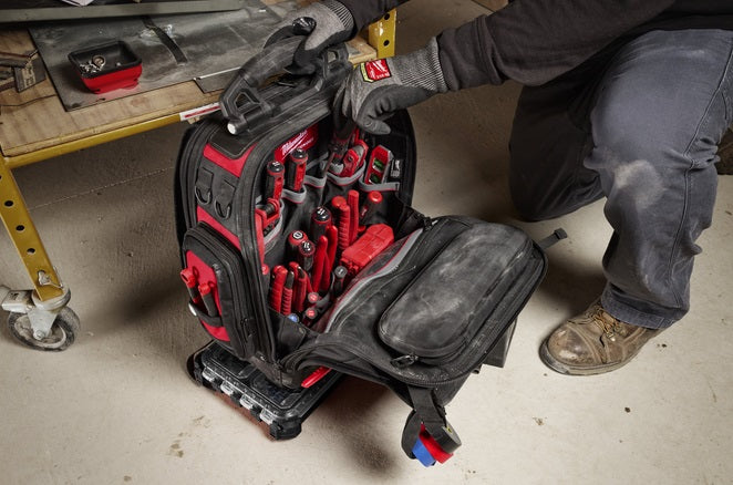 MILWAUKEE 4932498633 Раница PACKOUT Backpack 630 х 430 х 230 м е с товароносимост 22.7 кг и разполага с 42 джоба. Изработена е от издръжлив балистичния материал 1680D и 1800D. Раницата е снабдена със сгъваема дръжка за носене и е част от модулната система за съхранение PACKOUT.